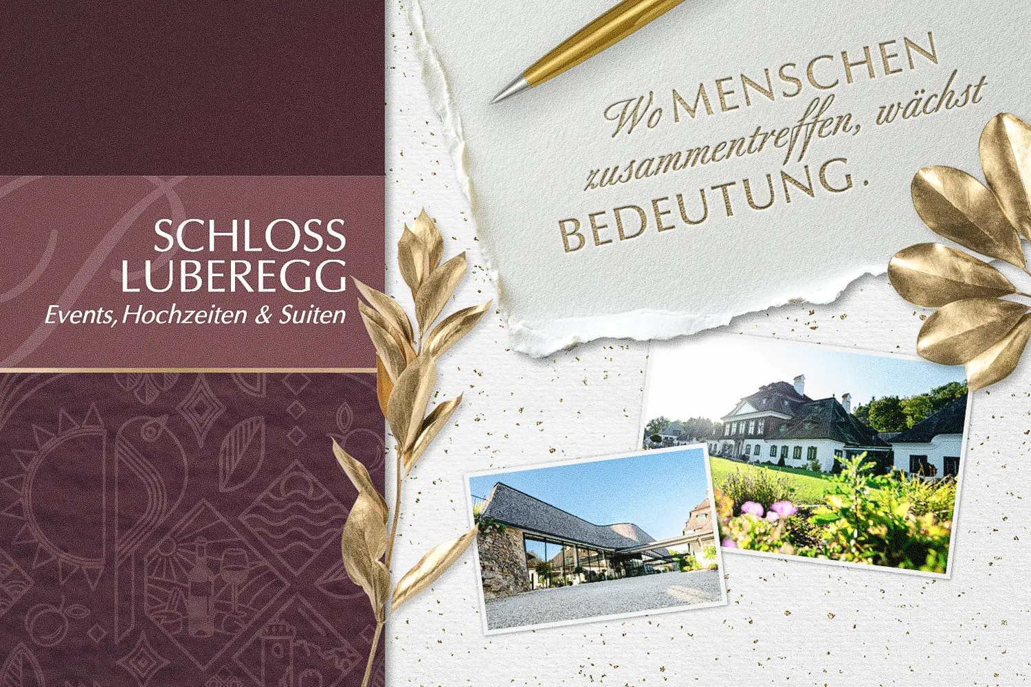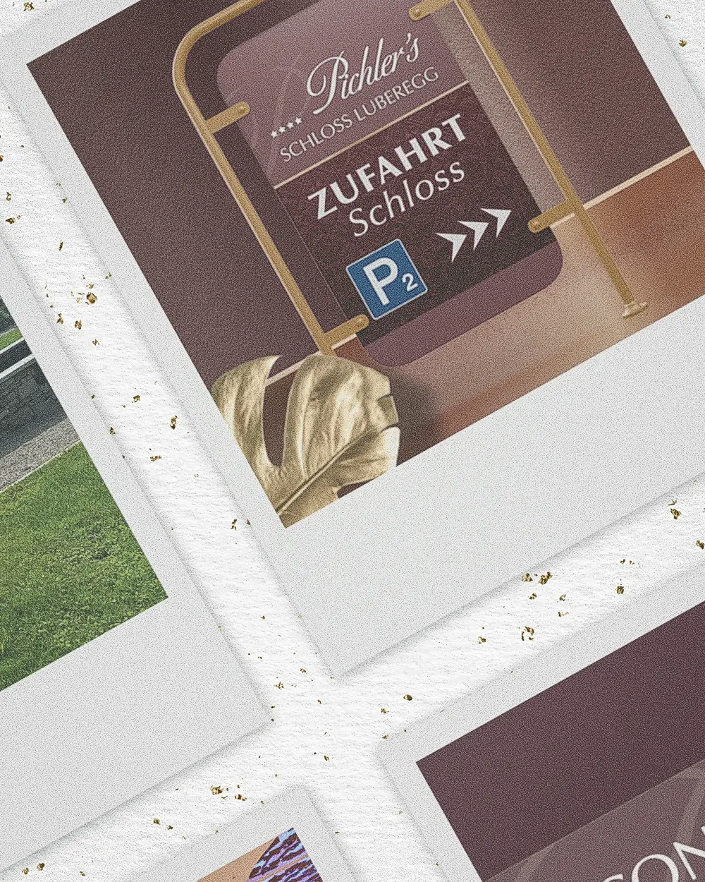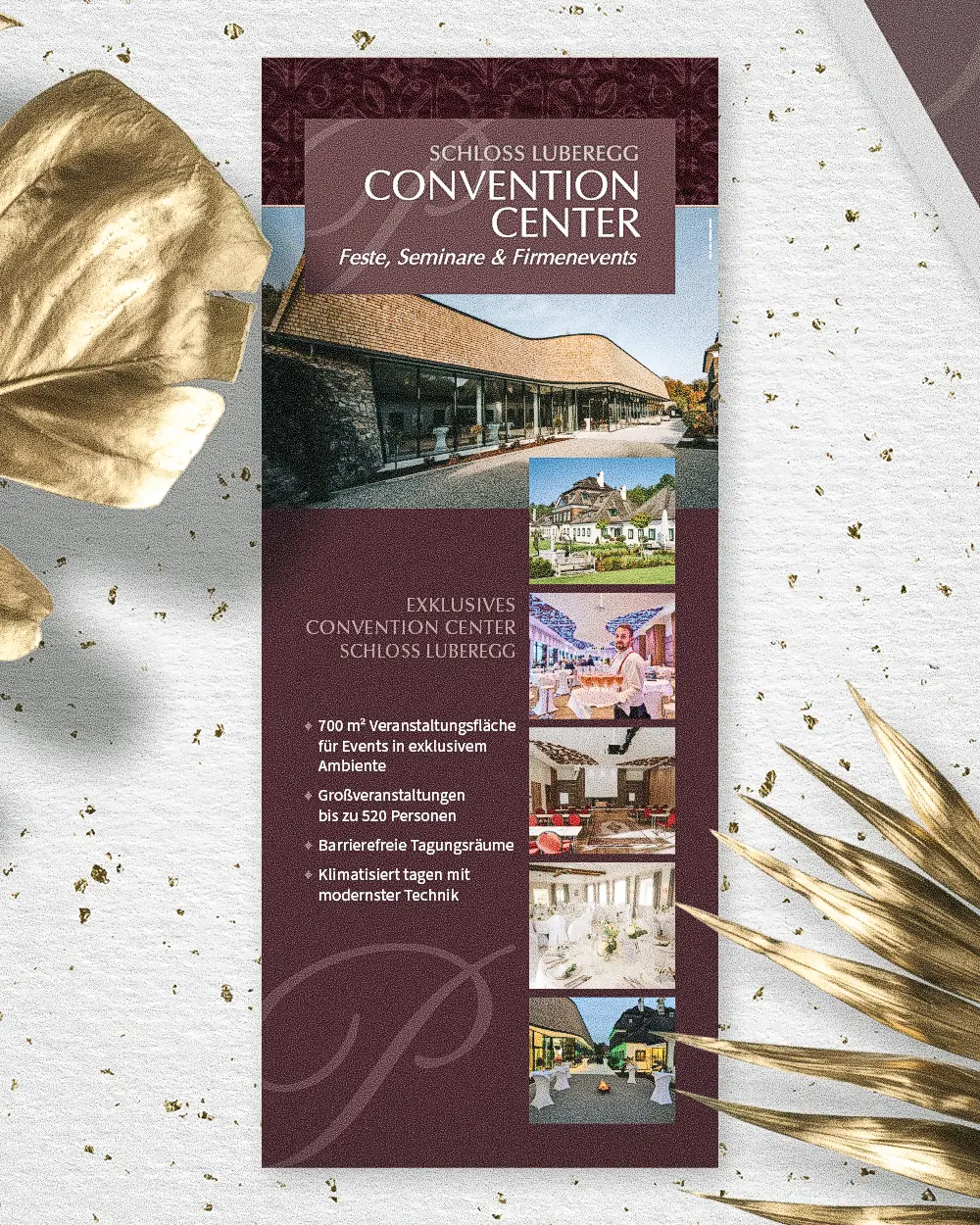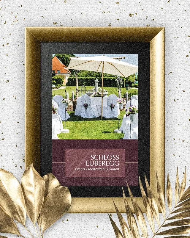 Corporate Design & Drucksorten – Stil, der bleibt Wir entwickelten ein klares, elegantes Gestaltungskonzept, das in allen Kommunikationsmitteln sichtbar wird – von Broschüren und Roll-ups bis hin zu Infotafeln und Drucksorten für Schloss Luberegg und das Convention Center. Das Design verbindet historische Eleganz mit moderner Klarheit – informativ, hochwertig und im Einklang mit der besonderen Atmosphäre des Ortes.